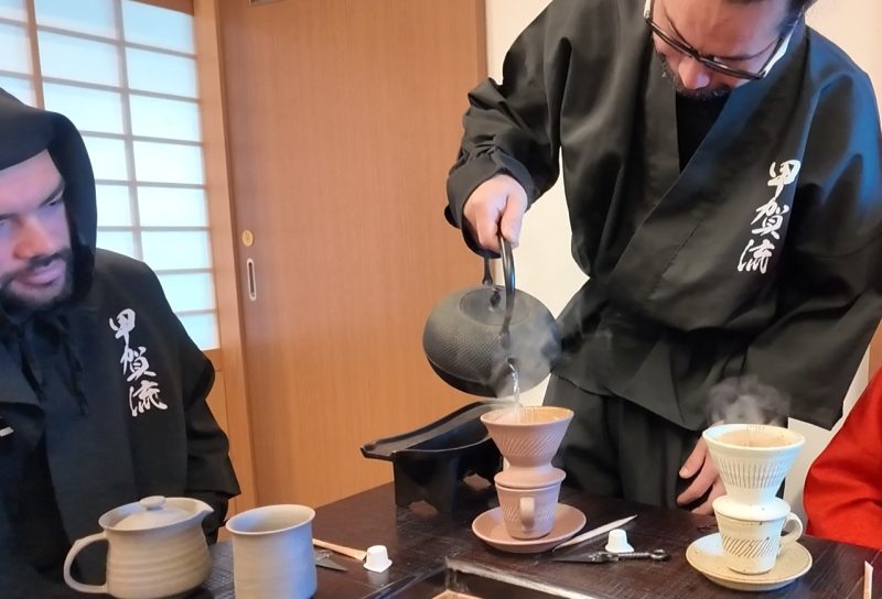 Once the beans are ground, blend them with medicinal herbs to create your own ""Ninja Coffee"" and enjoy it fresh via pour-over drip. Take a moment to relax at Jigen-ji Temple, a site deeply connected to the Koka Ninja. With its charming thatched roof and serene atmosphere, it is the perfect place to enjoy a peaceful break and a taste of history.